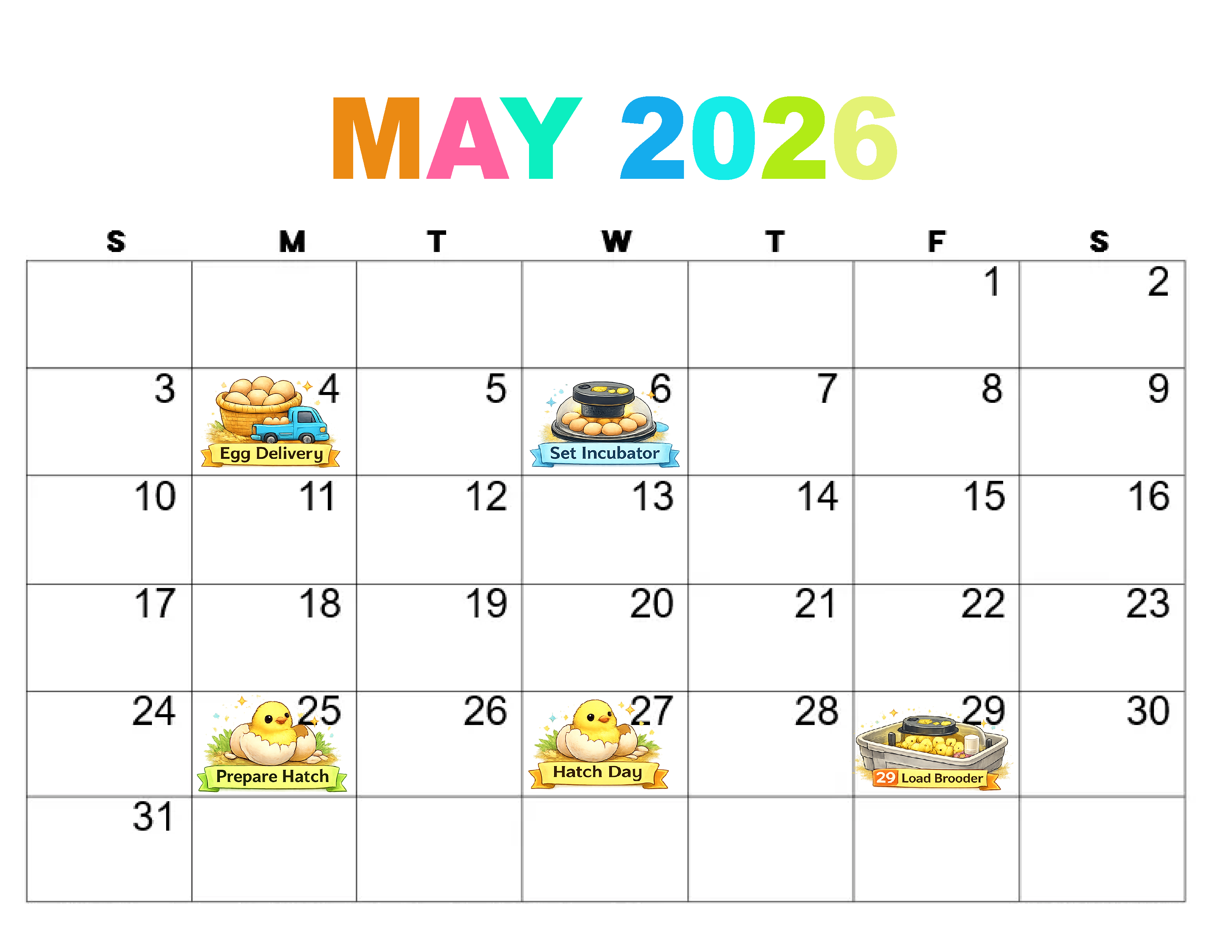 In the example above you receive the hatching eggs on May 4th and the hatched chicks would be picked up by Pips Farm on June 5th (not shown). The dates would be as follows: